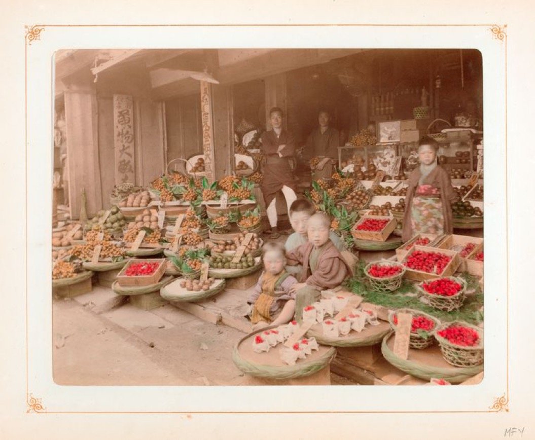 果物屋。こういった並べ方は、いまも八百屋で見かけますよね。