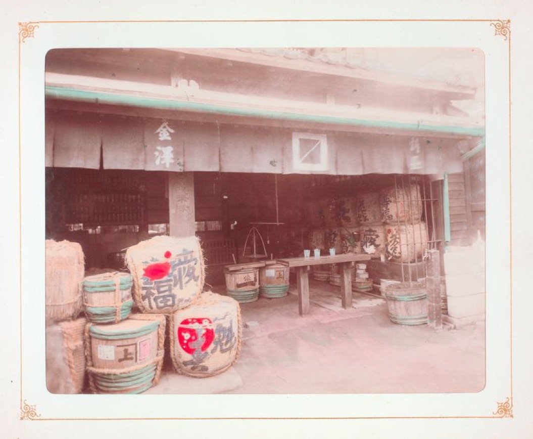 酒屋。樽が積み上げられています。