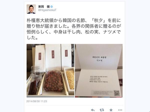 「パククネ大統領から贈り物がきたよ」というツイートをなぜか削除してしまった朝日新聞記者・東岡徹くん…一国の大統領から付け届けが来るなんてスゴイじゃないですか?…何でツイ消しちゃったの?もっと自慢したら?