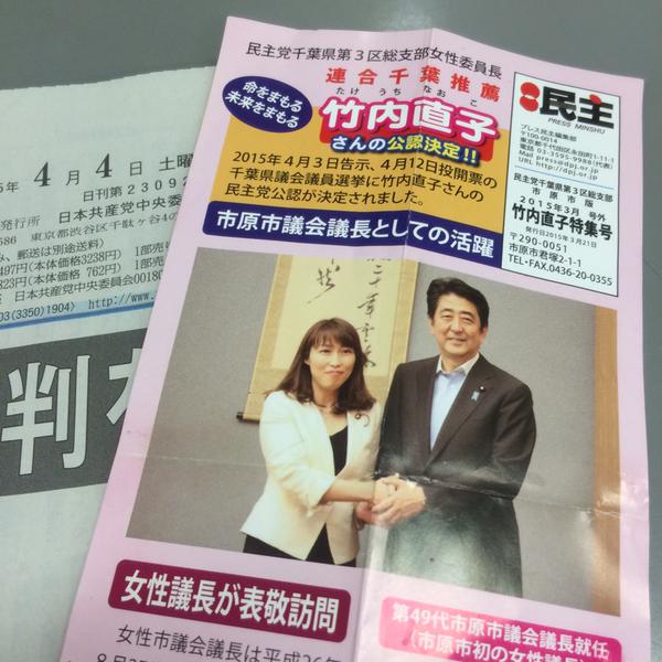 安倍首相とがっちり握手する民主党千葉県議選候補。民主広報が号外で特集したもの。これで集票を狙うようだ。(R) pic.twitter.com/fEF6HX0WM8
