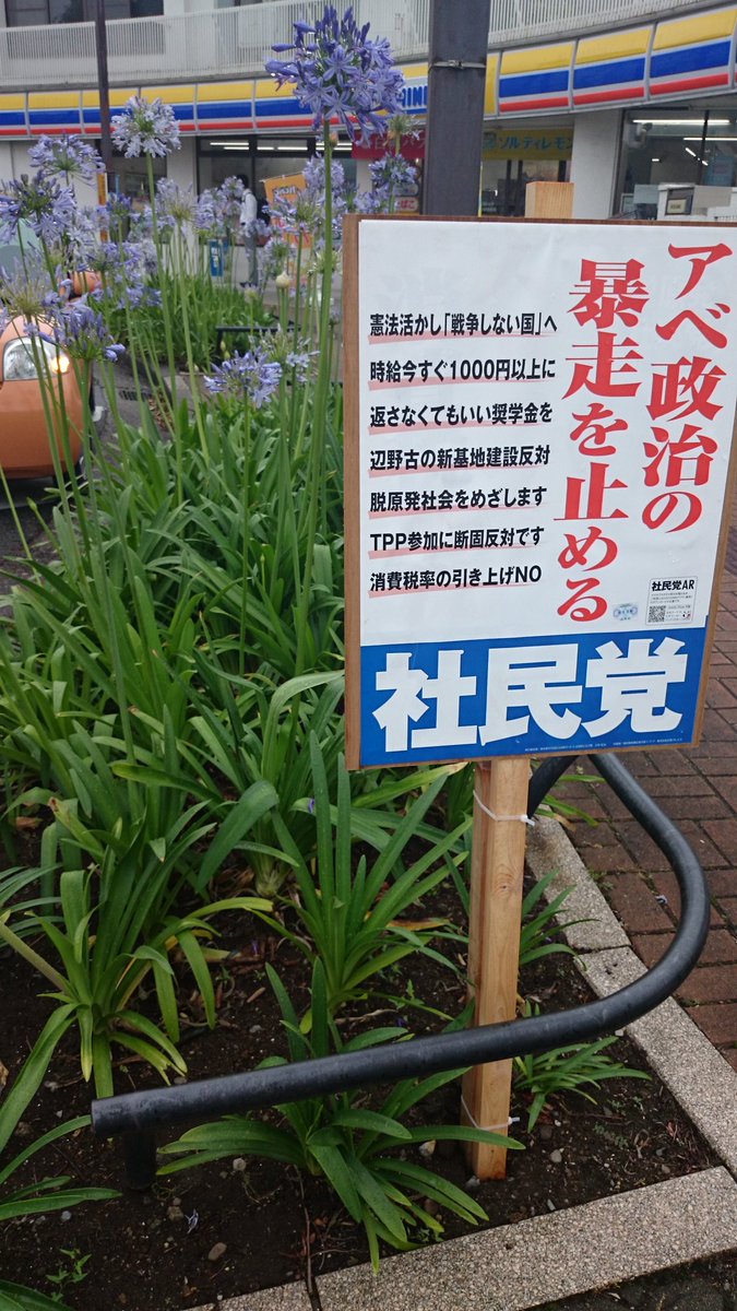 この投稿がもし選挙違反になるなら、すぐに削除する事を前提に投稿します。我が街の人たちが端正込めて作ったアガパンサスの花壇にこんな立て札のようなポスターが打ち込まれました。これを見て街の人がいい気持ちがするでしょうか。 pic.twitter.com/uotS4I4Jll