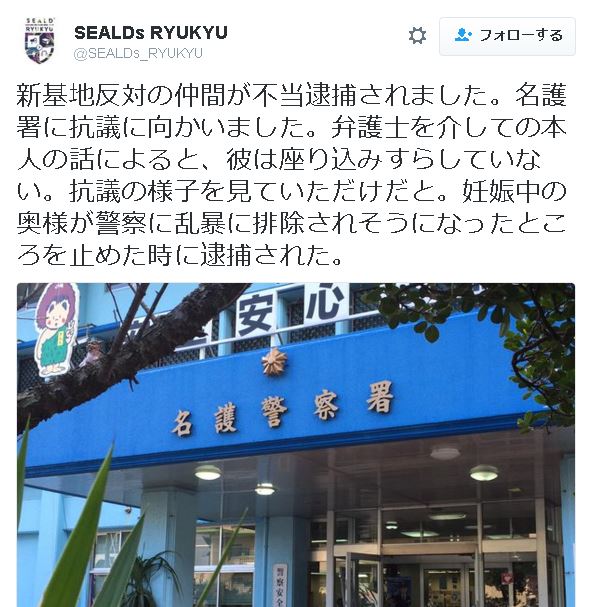 本日逮捕され、名護署に拘束されているキムさん朝鮮人罪状は高江の路上で牛歩運転し、 それを制止し警察官に車を接触させ公務執行妨害罪で現行犯逮捕。