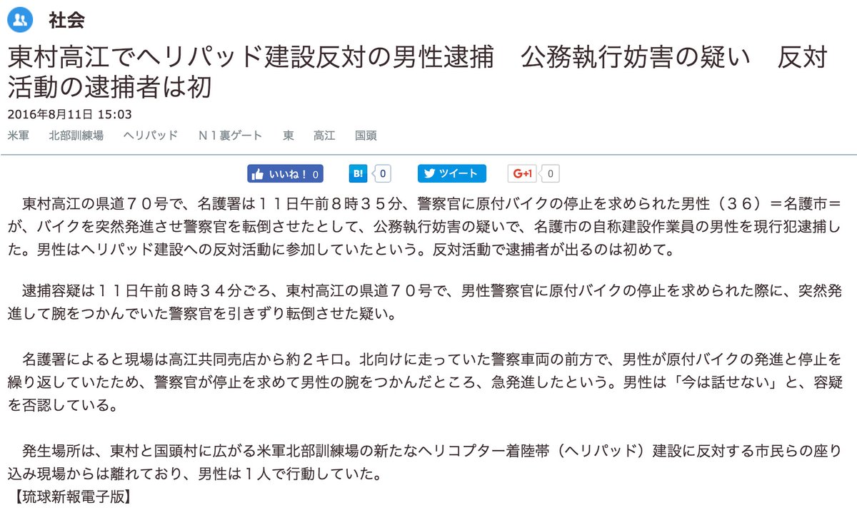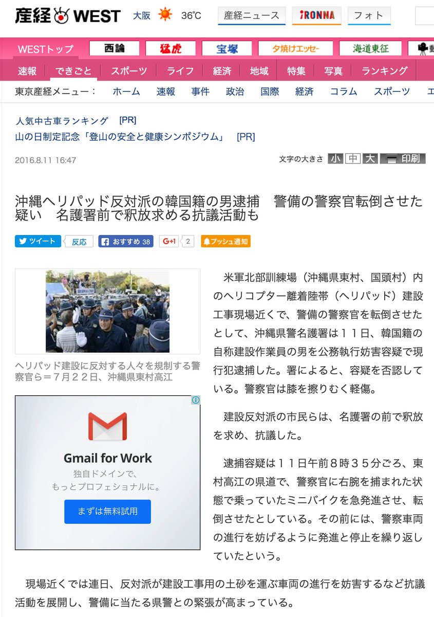 沖縄の高江で活動家が逮捕された件の比較。 産経新聞、沖縄タイムス、琉球新報。