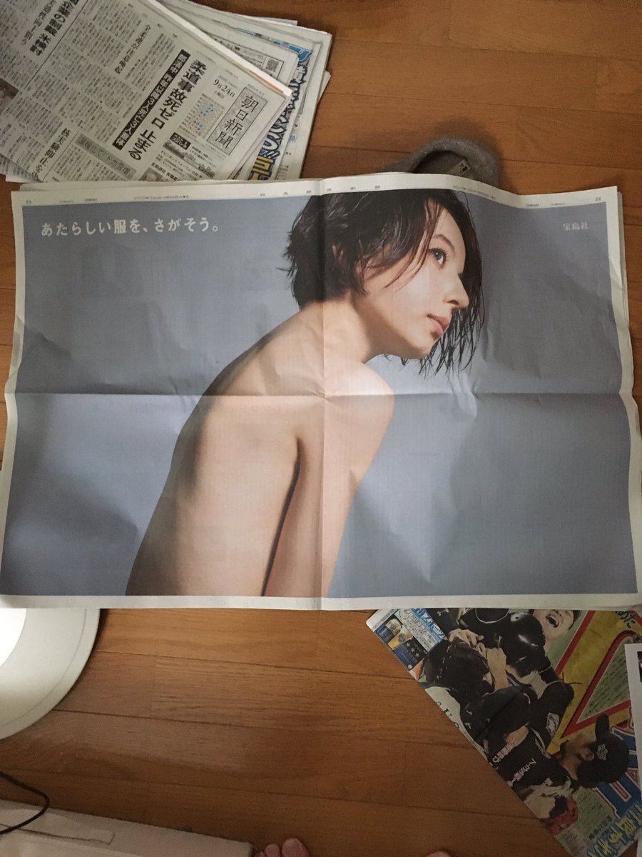 カラーの見開き広告で、上半身に何も身に着けていない“背中ヌード”を披露し、「あたらしい服を、さがそう。」というメッセージを体現している。