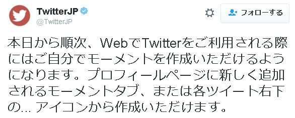 本日から順次、WebでTwitterをご利用される際にはご自分でモーメントを作成いただけるようになります。プロフィールページに新しく追加されるモーメントタブ、または各ツイート右下の... アイコンから作成いただけます。https://t.co/F6wKOS8ah6 pic.twitter.com/IrjAtewM3v