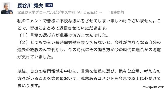 会社の業務をこなすというより、自分が請け負った仕事をプロとして完遂するという強い意識があれば、残業時間など関係ない。」などと発言、 同アプリ上でも「言い過ぎでは」「訂正したほうがよいのではないか」などと指摘されていました。