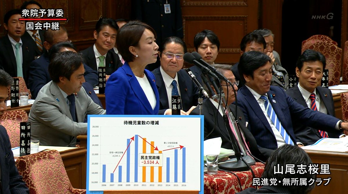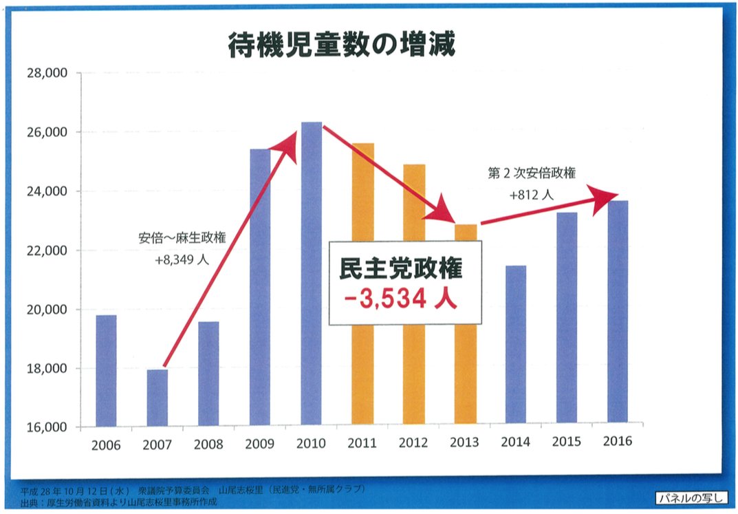 国会で、民進党の山尾が「待機児童」問題で使ったパネルのグラフが、 民主党政権は2009年から2012年までなのに、 「2010年から2013年まで」にずらしてあることが判明w