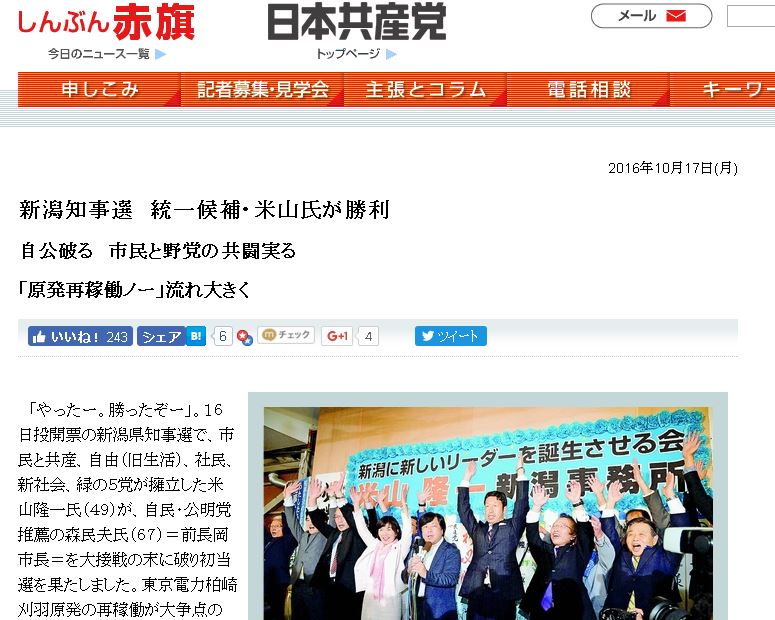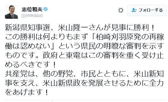 米山氏は選挙戦で福島事故の原因、健康と生活への影響、安全な避難方法の3つの検証がされない限り、 再稼働の議論は始められないと訴えていた。
