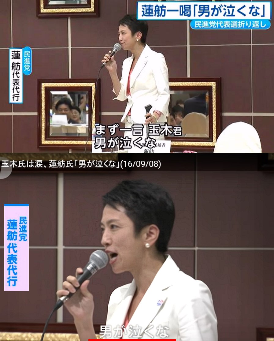 ・ 代表選の演説で「玉木君、男が泣くなよ!」と逆・男女差別発言する蓮舫。