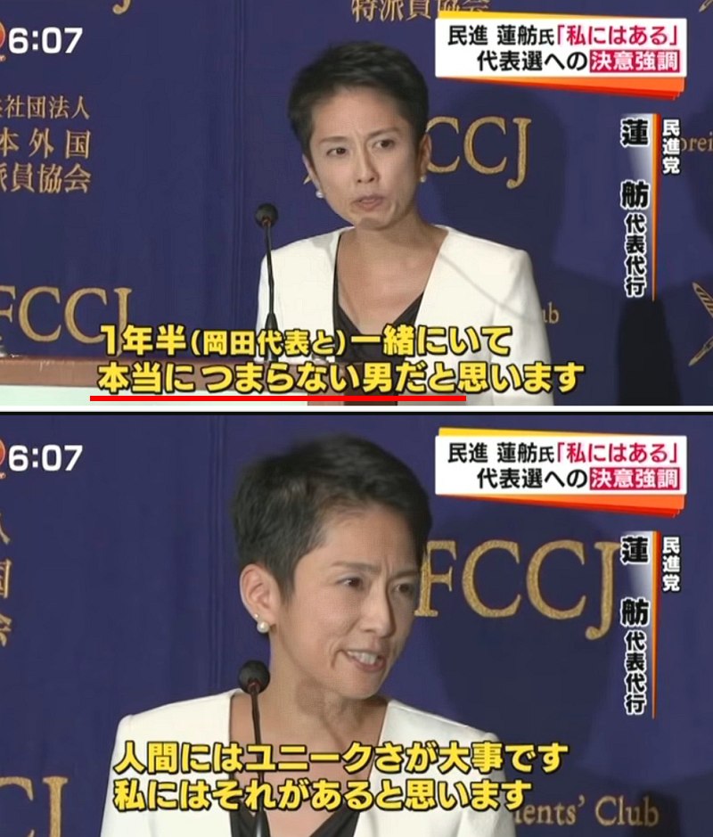 ・ 「前代表の岡田さんはつまらない男だが、私にはユニークさがある」と得意げな蓮舫。