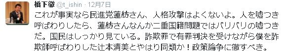 同日付の投稿で、「これが事実なら民進党蓮舫さん、人格攻撃はよくないよ。人を嘘つき呼ばわりしたら、蓮舫さんなんか二重国籍問題ではバリバリの嘘つきだ。国民はしっかり見ている。詐欺罪で有罪判決を受けながら僕を詐欺師呼ばわりした辻本清美とやはり同類か!政策論争に徹すべき」などと批判した。(産経新聞)