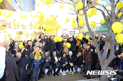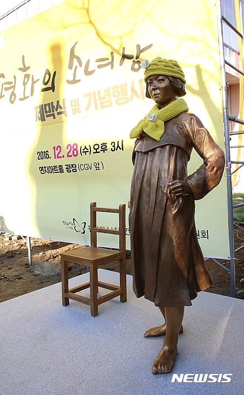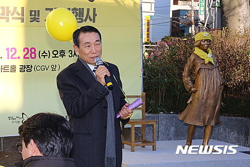 (井邑=聯合ニュース)韓日慰安婦合意1周年をむかえた28日、全北(チョンブク)井邑(チョンウプ)ヨンジアトゥホル広場で'平和の少女像'除幕式が開かれた。