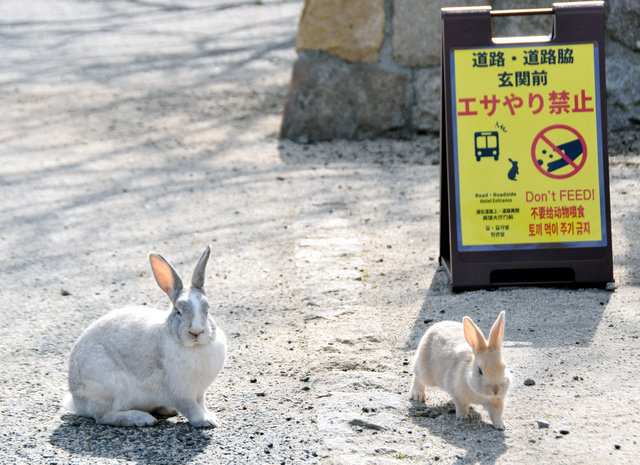 餌やり禁止はうさぎが事故に会うため、道路での餌やり禁止です。これは以前から禁止になってるもので、なかなか守れないので看板を見えやすいように変更してあります。