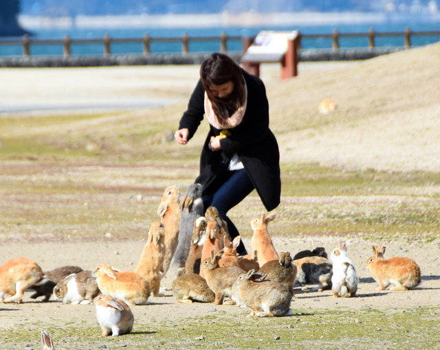 桟橋から島にあがると、白や茶色のウサギが10匹以上駆け寄ってきた。