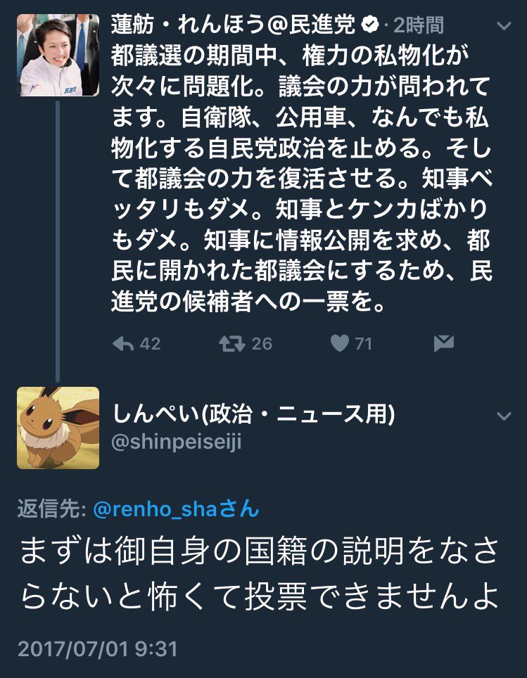 民進党への投票を呼びかける蓮舫代表に対して、「まずは二重国籍問題の説明責任を果たしてほしい」と意見を投げかけたところ、即座にブロックされてしまったという流れだ。