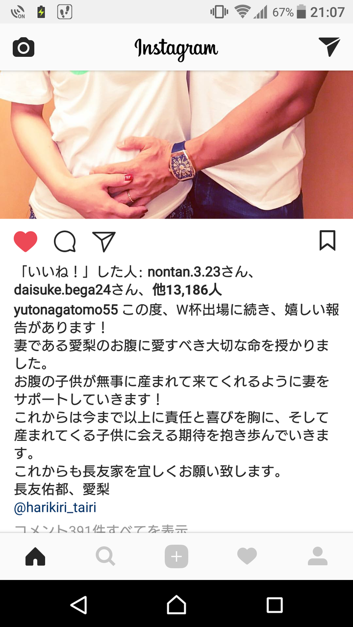 「お腹の子供が無事に産まれて来てくれるように妻をサポートしていきます!」と決意するとともに「これからは今まで以上に責任と喜びを胸に、そして産まれてくる子供に会える期待を抱き歩んでいきます。これからも長友家を宜しくお願い致します」と力強く呼びかけた。