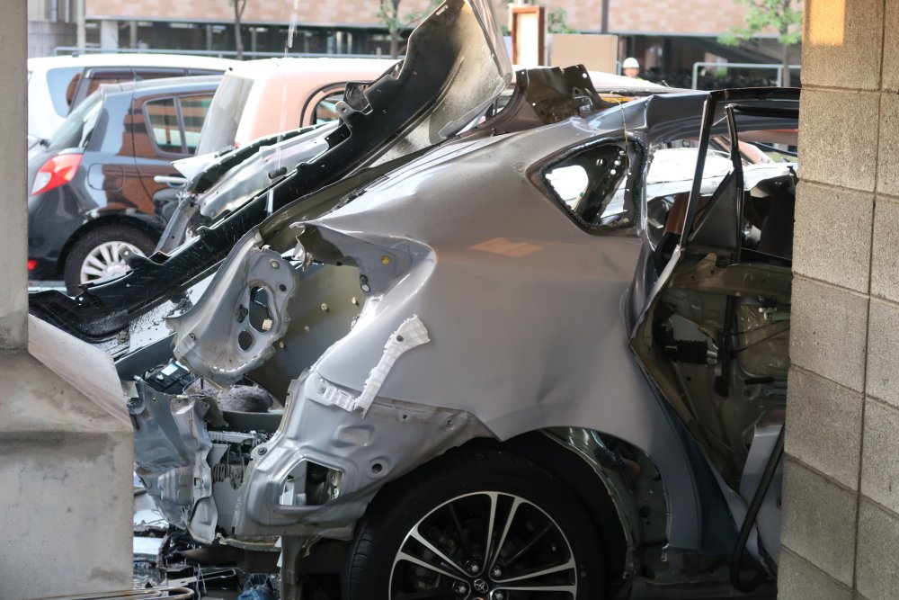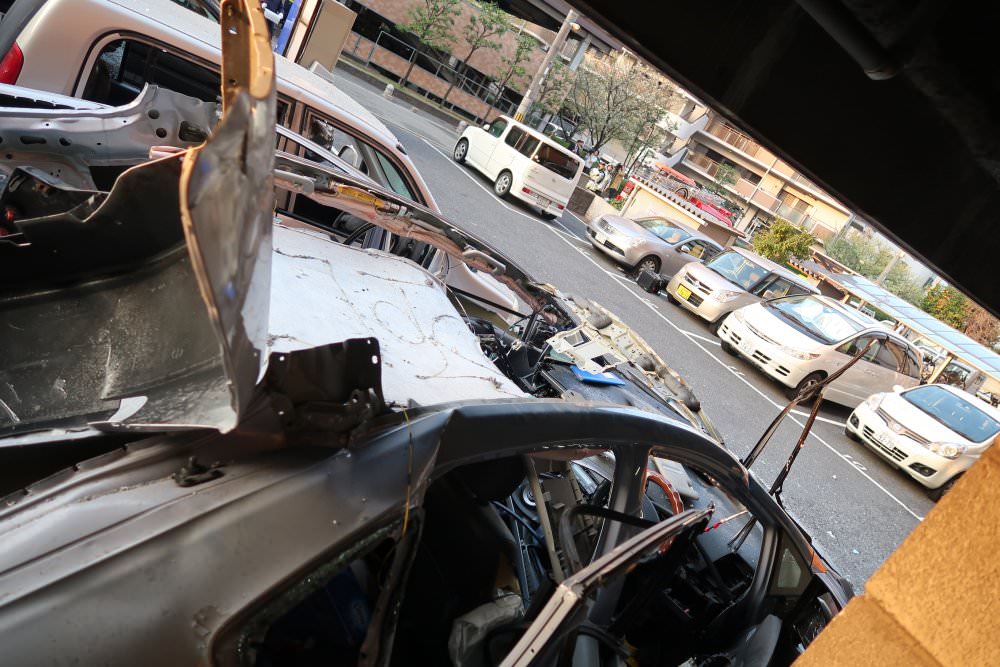 現場から約20メートル離れた路上まで車の部品が散乱。
