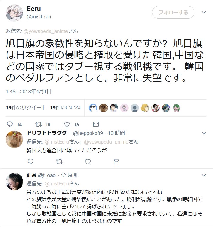 「旭日旗の象徴性を知らないんですか? 旭日旗は日本帝国の侵略と搾取を受けた韓国,中国などの国家ではタブー視する戦犯機です」