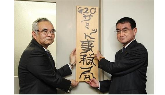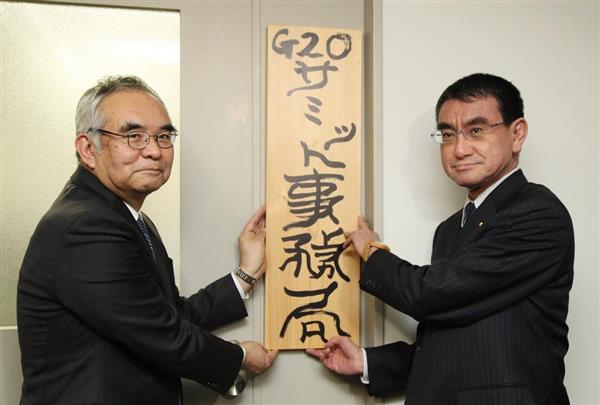 河野太郎外相は2日、2019年6月に大阪で開催する20カ国・地域(G20)首脳会合の事務局発足式に合わせ、自身が筆を執った「G20サミット事務局」の看板を外務省で報道陣に披露した。