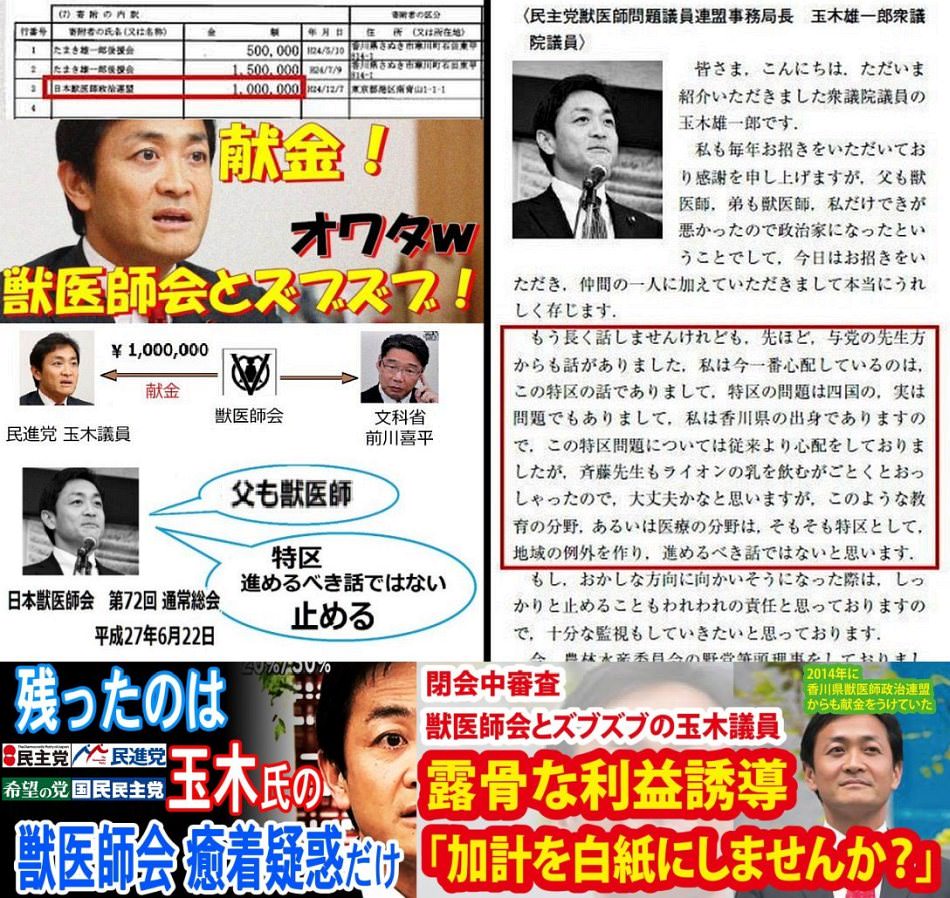 ★獣医師会から献金を貰って国会で「加計の獣医学部新設を白紙にせよ!!」と要求した玉木w