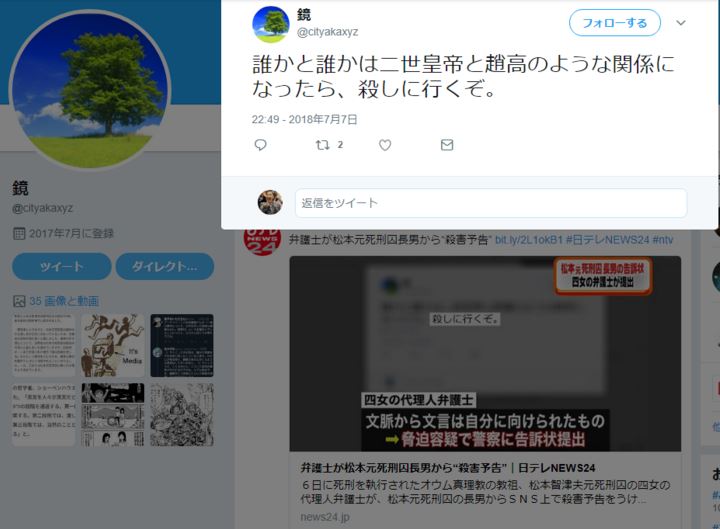 6日に死刑を執行されたオウム真理教の教祖、松本智津夫元死刑囚の四女の代理人弁護士が、松本元死刑囚の長男からSNS上で殺害予告をうけたとして、警察に告訴状を提出したことがわかった。(略)