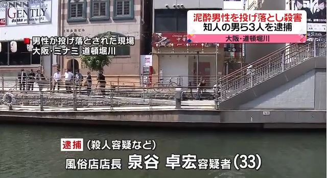 大阪・ミナミの道頓堀川に知人男性を投げ落として殺害したとして、大阪府警南署が殺人容疑で風俗店店長、泉谷(いずたに)卓宏容疑者(33)=同府茨木市鮎川=を逮捕していたことが14日、同署への取材で分かった。