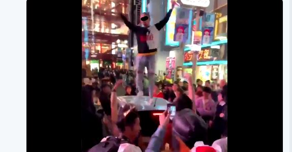 渋谷のハロウィンで先日トラックが横転させられるというトラブルがあったが、今度は近くのカラオケ館の前を走行していた乗用車の上に飛び乗るというトラブルが発生した。