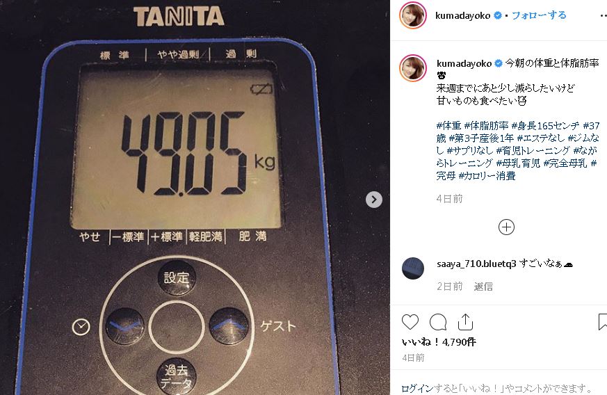 「今朝の体重と体脂肪率」というコメントとともに、体重計の写真をアップした熊田。