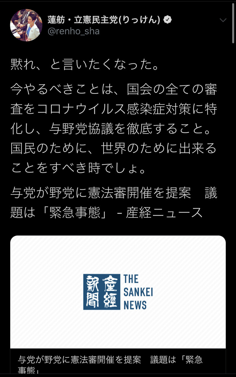 今やるべきことは、国会の全ての審査をコロナウイルス感染症対策に特化し、与野党協議を徹底すること。国民のために、世界のために出来ることをすべき時でしょ。