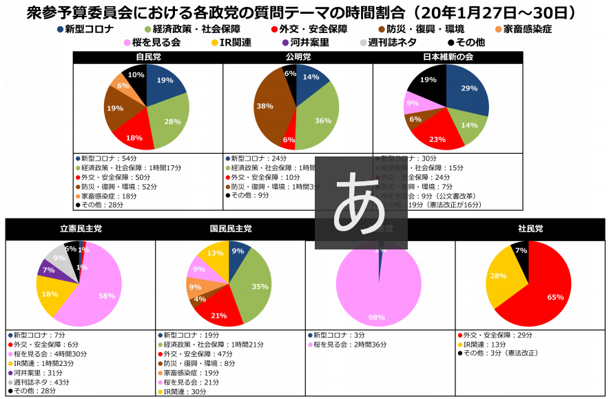 【武漢肺炎】新コロ審議時間 1/27~30の4日間合計で立民7分・国民19分・共産3分 なお桜ガーは7時間超