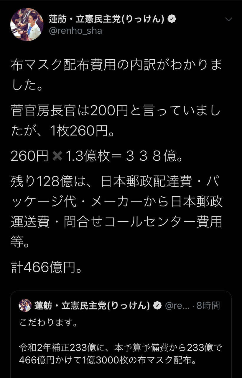 立憲・蓮舫氏 全世帯2枚の布マスク配布費用「466億円???!!嘘でしょ。見直しましょう」経費倍増見込みと猛批判