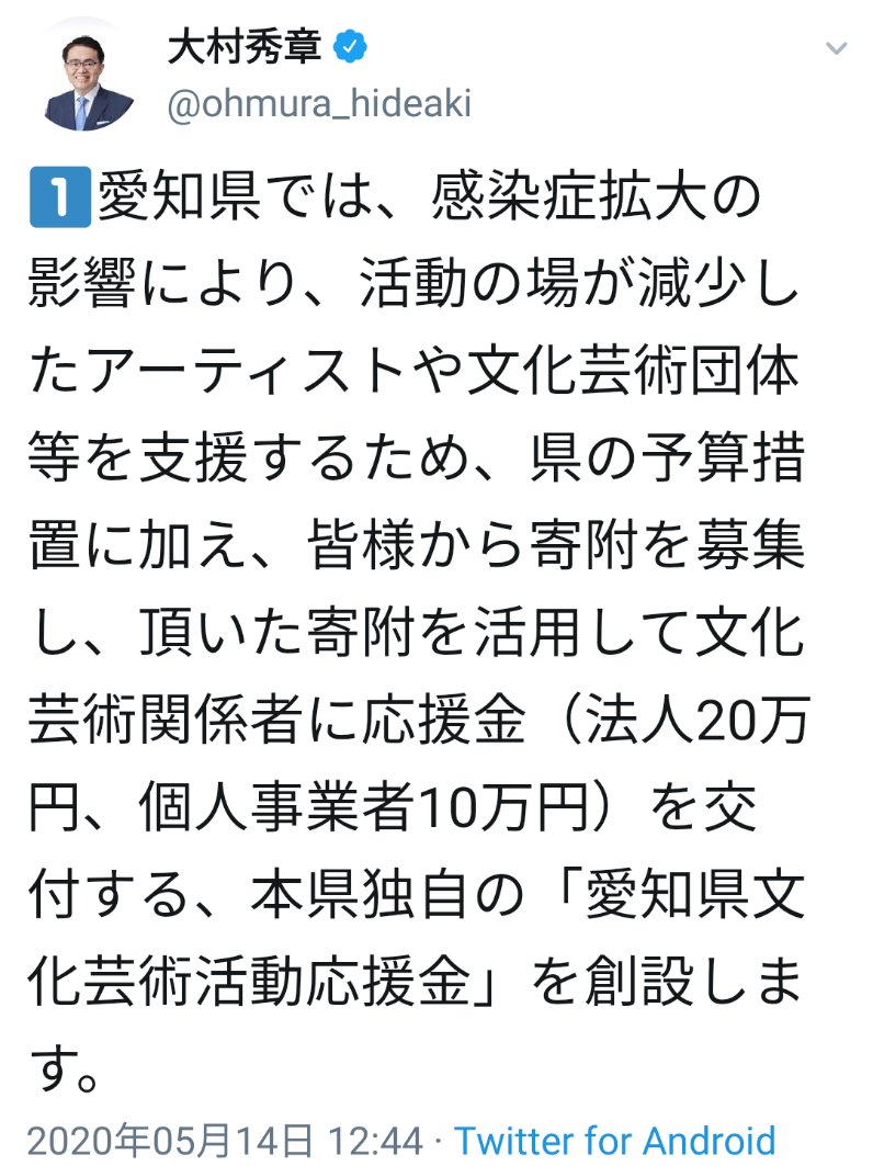 愛知県では、感染症拡大の影響により、活動の場が減少したアーティストや文化芸術団体等を支援するため、県の予算措置に加え、皆様から寄附を募集し、頂いた寄附を活用して文化芸術関係者に応援金(法人20万円、個人事業者10万円)を交付する、本県独自の「愛知県文化芸術活動応援金」を創設.... (略)