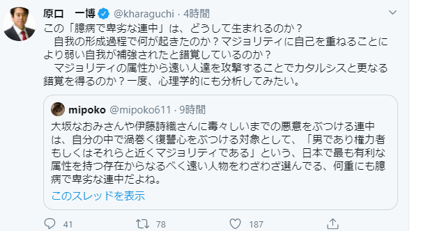 マジョリティの属性から遠い人達を攻撃することでカタルシスと更なる錯覚を得るのか?一度、心理学的にも分析してみたい。