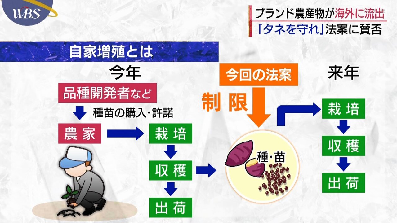 また、農家が収穫物から種子を採取して翌シーズンの生産に使う「自家増殖」について、現在は原則自由だが許諾制に変更する... (略)