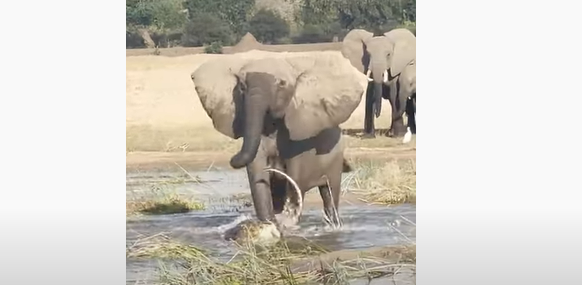 ロウワー・ザンベジ国立公園の南を流れるザンベジ川で8月、まだ授乳中と思われる母ゾウが浅瀬にいるワニを攻撃する様子がカメラに収められた。