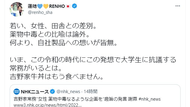 立憲民主党の蓮舫参議院議員が、牛丼チェーン・吉野家の不買を宣言し、物議を醸している。
