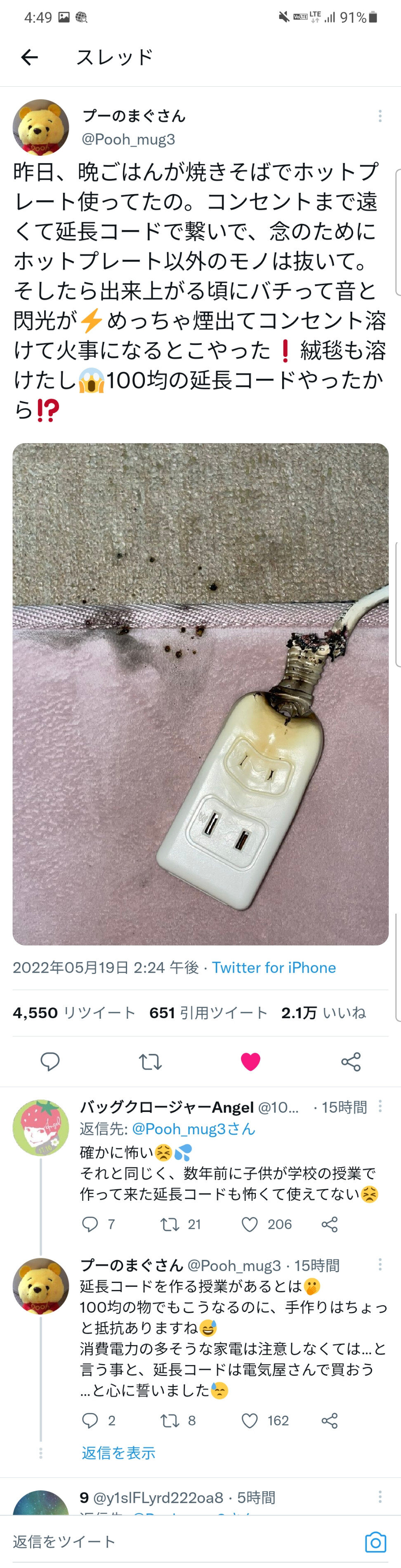 そしたら出来上がる頃にバチって音と閃光が⚡️めっちゃ煙出てコンセント溶けて火事になるとこやった❗️絨毯も溶けたし😱100均の延長コードやったから⁉️ pic.twitter.com/goXBLse4Ov