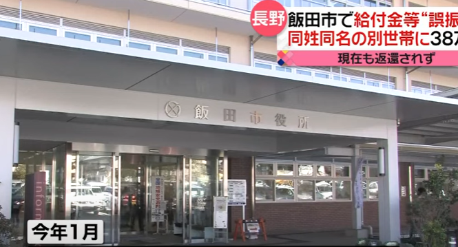 長野県飯田市は16日、臨時記者会見を開き、児童手当など計38万円の振込先を誤り、本来支給するべき世帯とは別の世帯の口座に振り込んだと発表した。