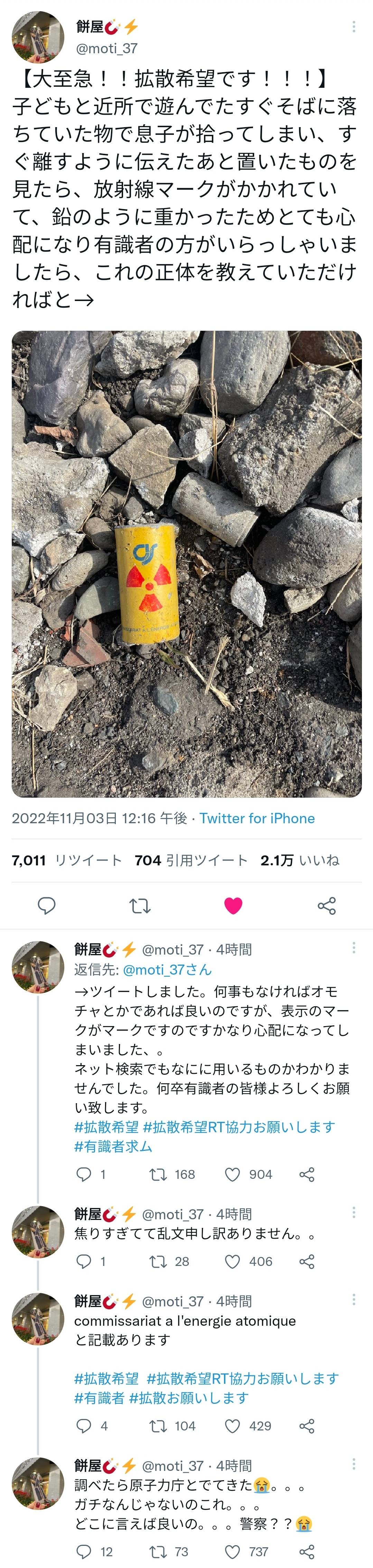 子どもと近所で遊んでたすぐそばに落ちていた物で息子が拾ってしまい、すぐ離すように伝えたあと置いたものを見たら、放射線マークがかかれていて、鉛のように重かったためとても心配になり有識者の方がいらっしゃいましたら、これの正体を教えていただければと→ pic.twitter.com/bCYxJf2IUT
