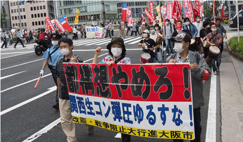 「法円坂55」の歌や府警本部へのシュプレヒコールを挟みながら、れいわ新選組の大石あきこ衆議議員、木村真豊中市議、反原発若狭の会、バンドレーダー京都基地に反対するグループ、三里塚・関西実行委員会、大阪教育合同、ケアワーカーズユニオン、大阪西運送労組、郵政産業ユニオン、日教組奈良市、全国水平同盟西郡、関西共同行動、全交、なかまユニオン、関西合同労組、港合同、全港湾などの方々の発言が続きました。