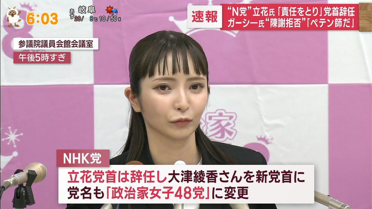 また、立花氏は政党名をNHK党から「政治家女子48(フォーティーエイト)党」に変更したと発表...(略)