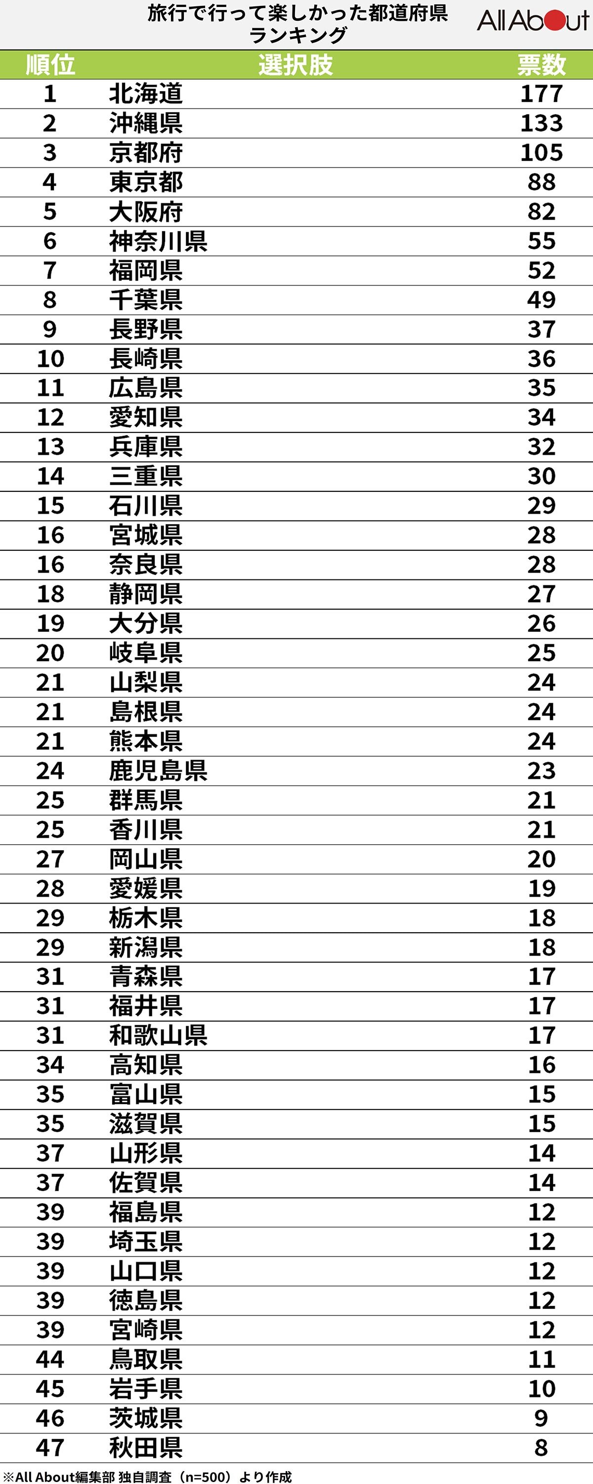 今回はその中から、「今まで旅行に行って楽しかった都道府県」について聞いた結果をランキング形式で紹介します