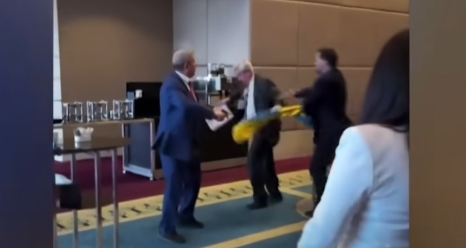 すると、ロシア代表団長のワレリー・スタヴィツキー氏がその国旗を取り上げて、その場を離れた。