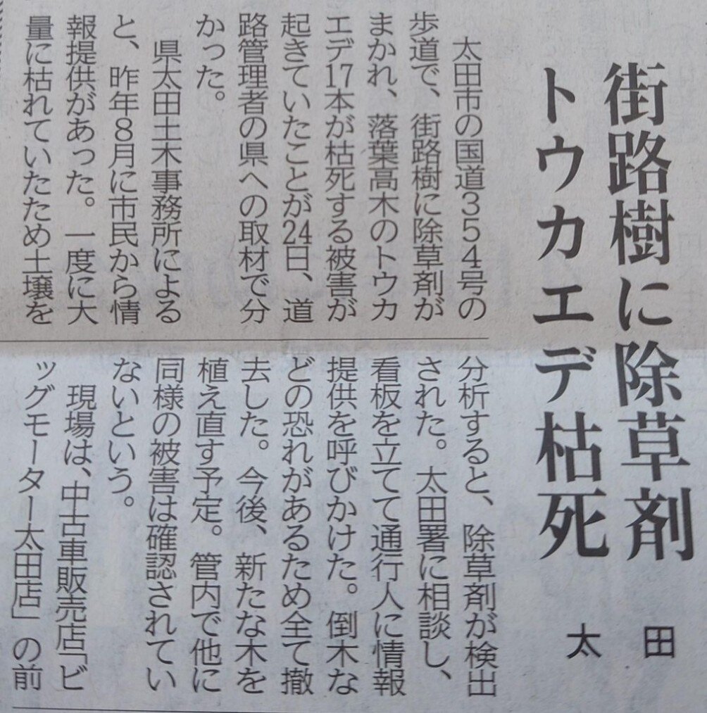 街路樹をめぐっては、群馬県太田市内にある店舗前の道路で「この場所で除草剤散布が原因の街路樹大量枯死が発生」したとして地元の群馬県警太田警察署と太田土木事務所が情報提供をもとめる看板を掲示していたとSNSで拡散されていた。