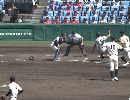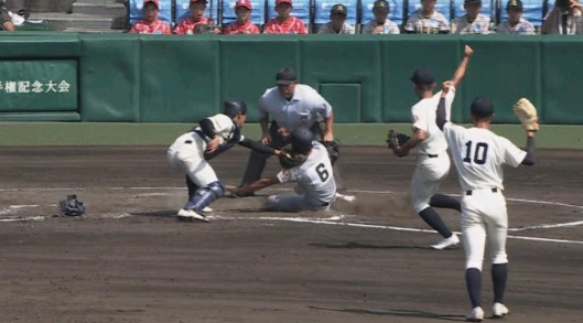 捕手のタッチと走者のベースタッチのタイミングは際どかったが、審判はセーフと判定した。勝ち越しの1点を入れたことで、仙台育英は勢いづいた。