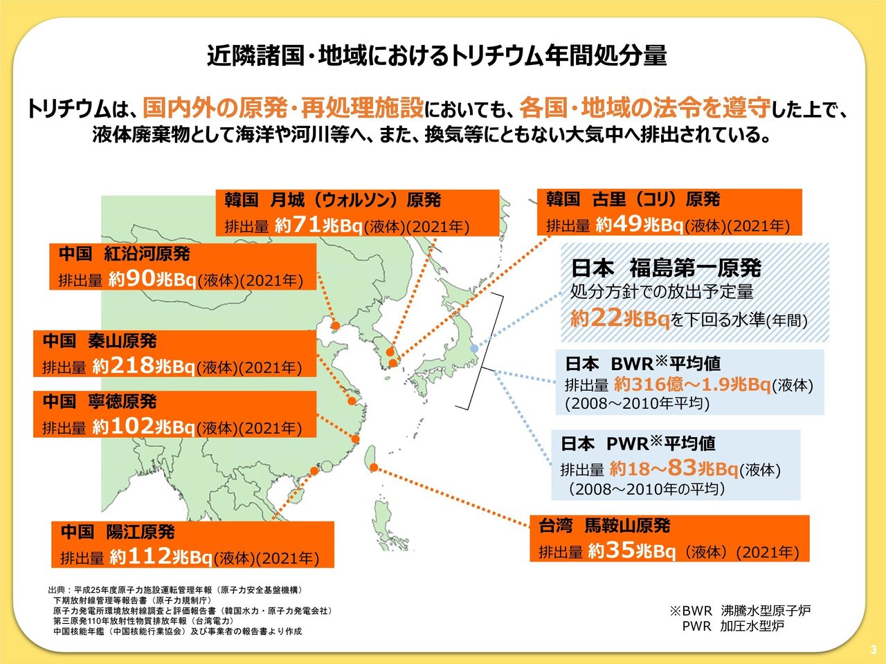 それによると、2020年に浙江省・秦山第三原発は約143兆ベクレル、21年に広東省・陽江原発は約112兆ベクレル、福建省・寧徳原発は約102兆ベクレル、遼寧省・紅沿河原発は約90兆ベクレルのトリチウムを放出していた。