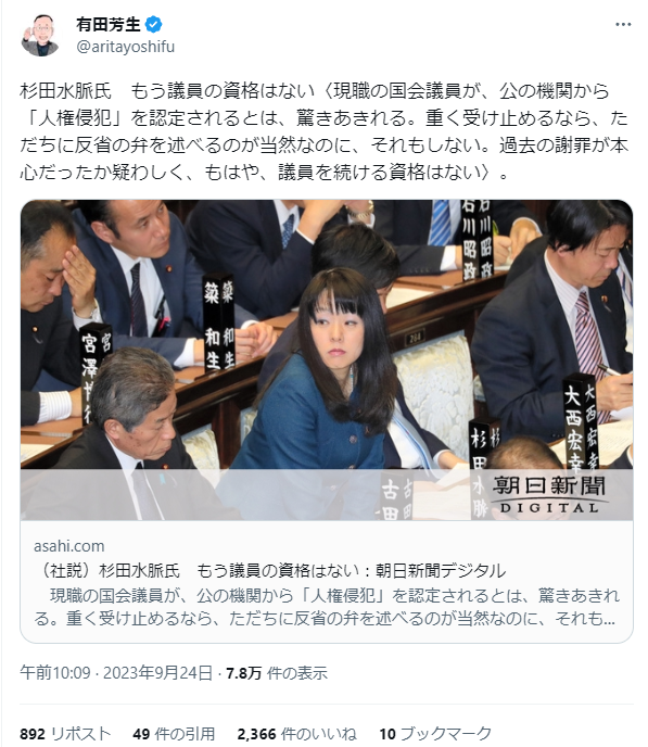 杉田水脈氏 もう議員の資格はない〈現職の国会議員が、公の機関から「人権侵犯」を認定されるとは、驚きあきれる。重く受け止めるなら、ただちに反省の弁を述べるのが当然なのに、それもしない。過去の謝罪が本心だったか疑わしく、もはや、議員を続ける資格はない〉。