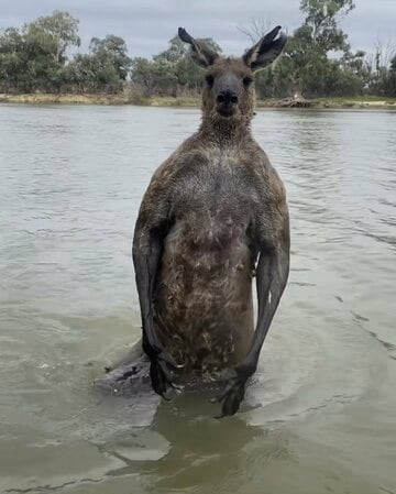 <筋骨隆々のカンガルーと浅瀬で一騎討ち。一体どんな状況なのか>