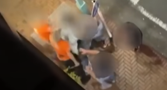 複数の人物が、オレンジ色のTシャツを着た男に詰め寄ると…髪の毛を手でつかみ、殴る蹴るの暴力を振るう。