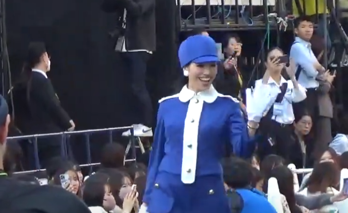 この日は1970年当時の万博の衣装を再現したブルーのミニスカート姿で登場するや、沿道から歓声が沸き起こった。